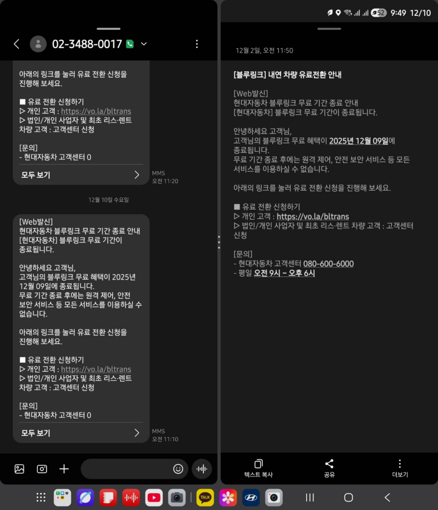 - 차에서는 따로 블루링크 기능이 자동으로 빠지거나 하지는 않는데, 일단 분할화면 옵션은 초기화 되었고, 디지털 액자 기능도 꼴에 블루링크 기능이랍시고 ‘블루링크 좋으니까 가입하셔요’ 라는 메시지를 띄워둡니다. 그리고 그 메시지를 메시지박스처럼 구성해놨는데 [확인]과 [뒤로] 버튼이 순서대로 배치되어 있는데요. 뒤로가 오른쪽에 있는 블랙패턴도 그렇고, 확인 버튼 누르면 블루링크 가입 방법이 (굳이 필요없지만)친절하게 안내됩니다.