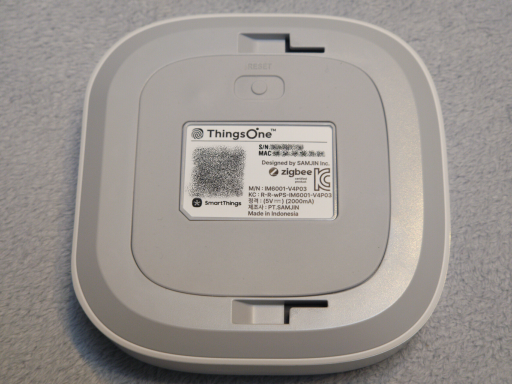 하단부는 스마트싱스 허브를 연결할 수 있는 QR코드와 각종 제품 정보들, 그리고 리셋 버튼이 마련되어 있습니다. 완전히 공장초기화를 하는 버튼이라고 하니, 중고거래할때쯤 또는 뭔가 꼬여서 완전히 날려야 할때 제외하고는 쓸 일이 없을 버튼이긴 하겠네요. 요즘 공유기들이 하도 찌르는 버튼으로 많이 만들어둬서 그런가 신선합니다. 하판 자체는 실리콘 마감이 되어 있어서 바닥에 놓으면 마찰에 의해 잘 움직이지 않도록…은 하는데 애초에 제품이 너무 가벼워서 상황에 따라 케이블 장력에 딸려 갈 것 같습니다.