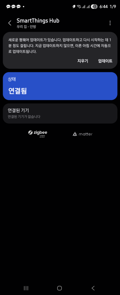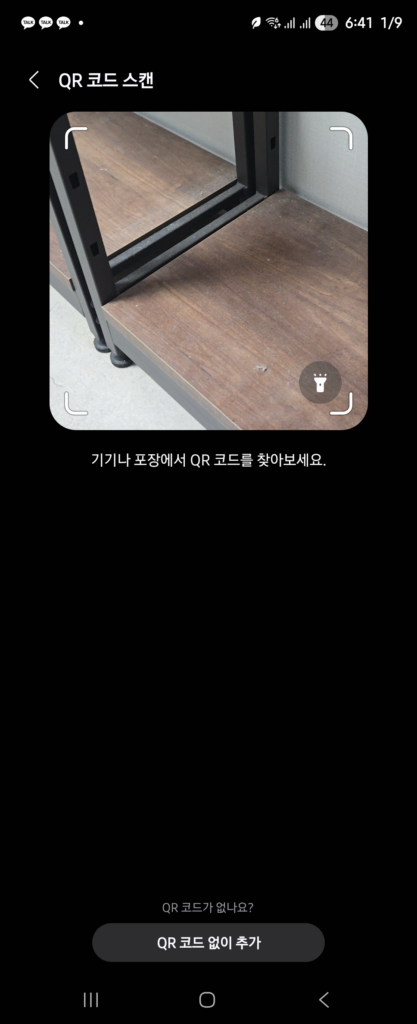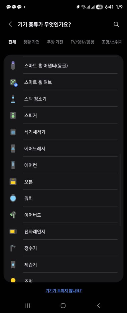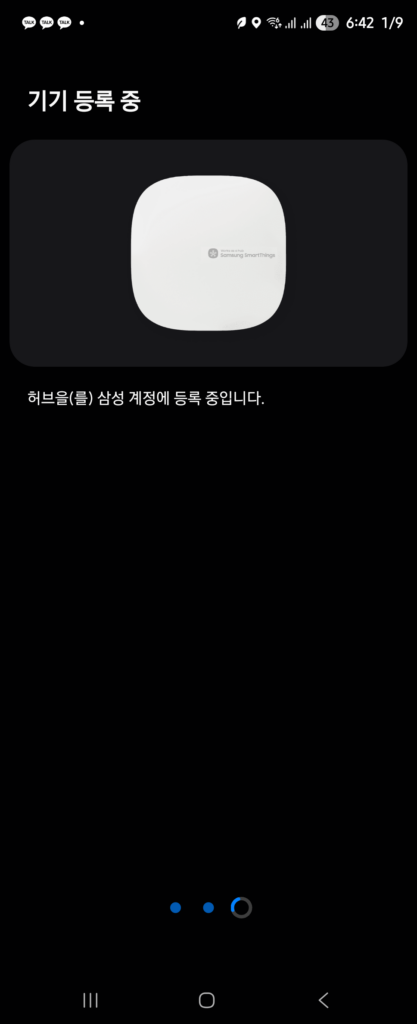 본격적으로 연결해봅니다. 처음에는 초록불, 그뒤로 빨간불과 초록불 깜빡, 초록불만 깜빡, 정상적으로 셋팅이 끝나면 파란불이 들어왔(던걸로 기억…)습니다. 딱히 뭐 특이사항은 없고, 휴대폰에 딱히 뭐가 뜨거나 하지는 않아서 스마트싱스 앱에서 기기추가로 추가를 진행해봤습니다.