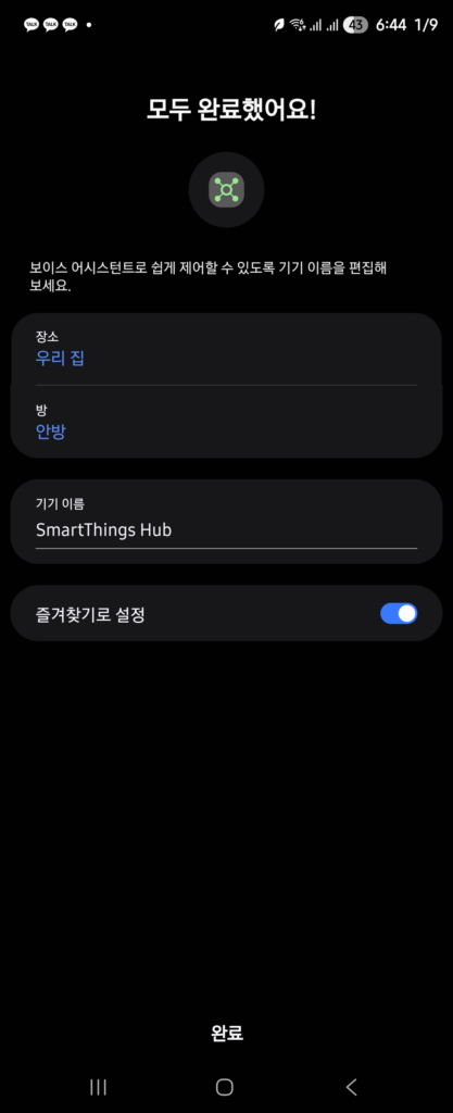 연결 과정에 딱히 불편함이 있거나 매끄럽지 않은 부분은 없었습니다. 자동으로 안뜬건 아쉬웠는데, 그게 제 환경에 뭔가 문제가 있어서 안 뜬건지는 모르겠구요. 여튼 기기추가에서 스마트홈허브 선택하고 QR을 찍으니 대충 1분 정도동안 셋팅하다가 정보를 입력받고 완료를 했습니다. 지금은 테스트배드겸 해서 안방에 설치했으니 안방으로 위치를 했습니다.