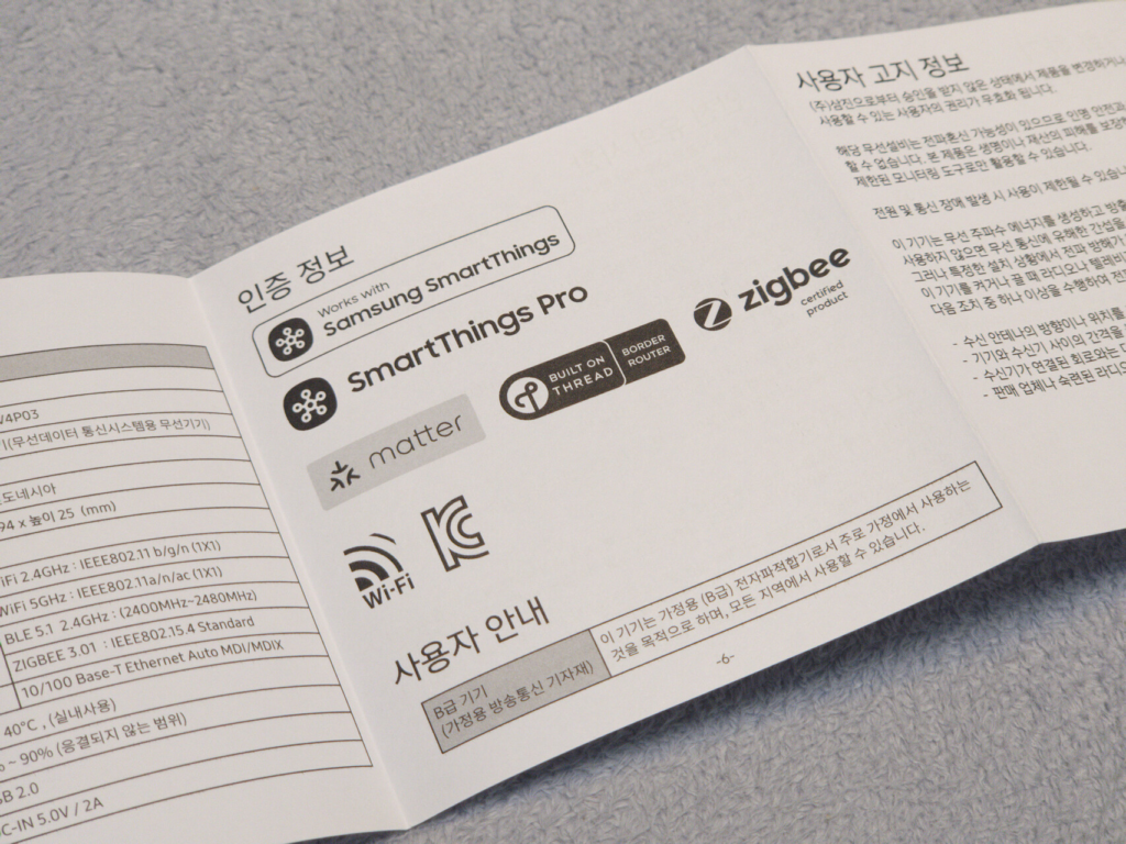 인증정보상, 메타, 메타오브쓰래드, 지그비를 지원합니다. V3 에서는 Z-wave가 되었다고 했었던거 같은데, 대충 알아보니 애초에 Z-wave 프로토콜 제품이 딱히 없긴 했네요. 내부적으로 와이파이도 있는데, 이 와이파이가 LAN을 연결하지 않았을 때 외부 연결용인건지, 메타구현을 위한 와이파이인지는 제가 잘 모르겠습니다. 이게 제일 궁금했지만, 뭐 알아낼 순 없었고 정말 단순한 최초 실행 가이드 수준의 문서였습니다.