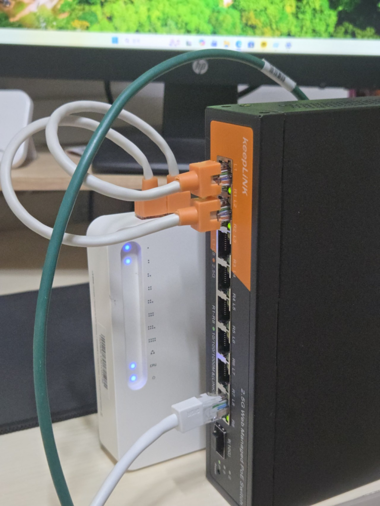 뭐 사실 링크 속도가 정말 포트 트렁킹 되서 2Gbps로 확장됬을지는 모릅니다. 일단 iptime쪽에서는 정말 포트트렁킹을 ‘지원은 한다’ 수준이라서, 뭐 엉망입니다. 1,2번 포트가 다 꼽혀 있지만 하나의 포트에 장비가 연결된걸로 인지합니다. 링크 속도도 1gbps로만 표현되구요. 그런데, 뭐 속도 테스트 하면 어찌됬든 두 포트 모두 빠르게 깜빡이는걸 보면 되긴 하나 보네요.