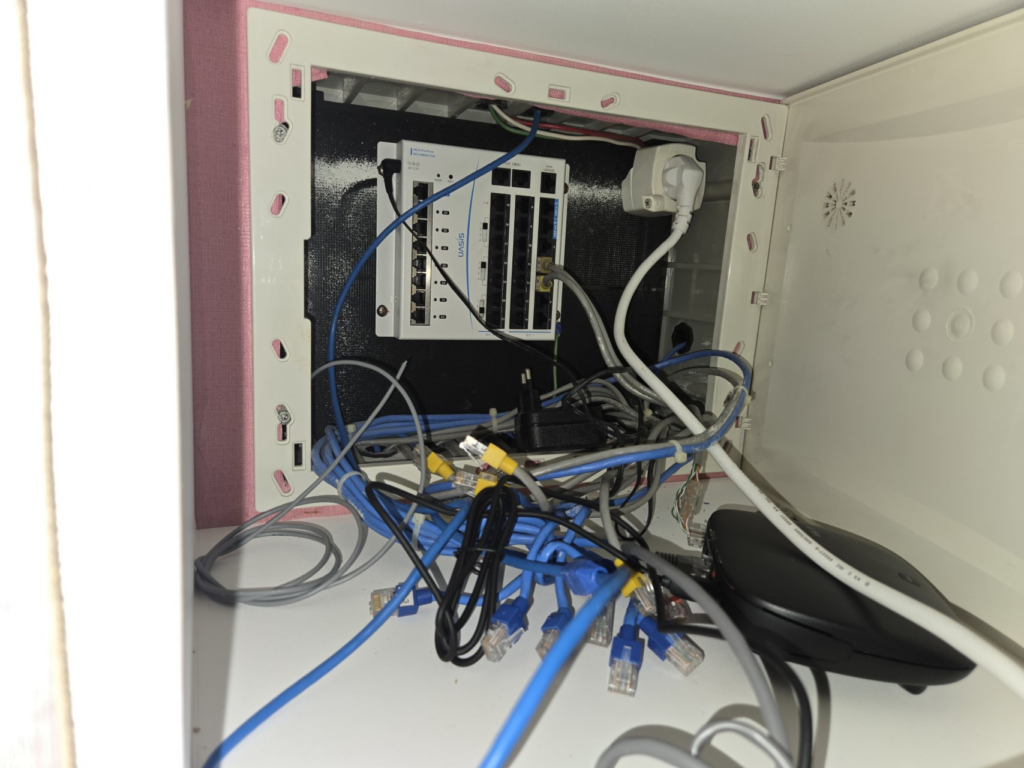 이 단자함이 지금 일단 다락방 올라가는 계단 아래에 수납함 만들어둔 곳 완전 안쪽으로 해서, 만들어져 있어서 일단 접근성이 나쁘구요. 다행인점은 덕분에 내부에 공간이 널찍해서 무엇이든지 대충 가져다놓기 좋은 위치긴 합니다. 미니 PC 서버 한 20대는 들어갈 빈 공간이 있어요. 하지만 케이블들이…