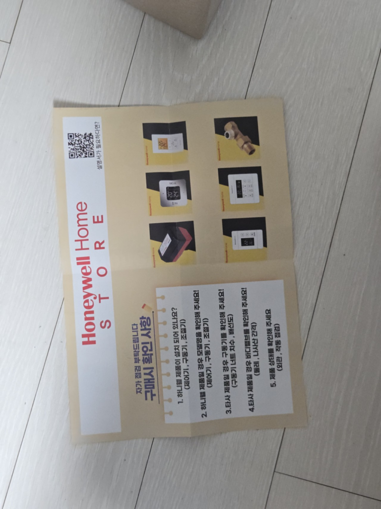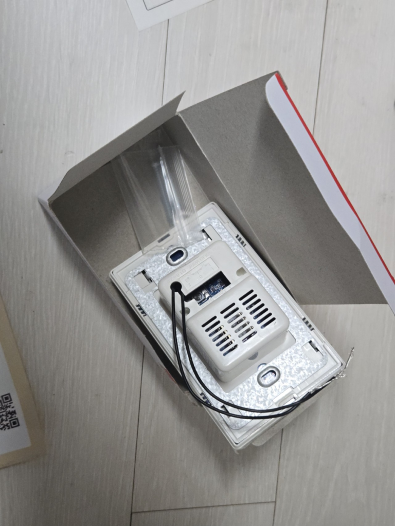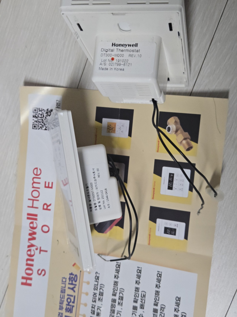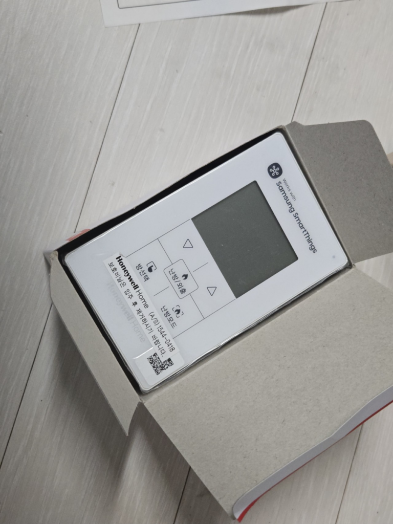 박스를 열어보면, 본품이 반겨줍니다. 사실 베이스는 DT300M 온도조절기 (DT300 거실형 온도조절기) 이구요. 모델명은 DT300’ST’-M 입니다. 상단에 삼성스마트싱스 로고가 큼지막하게 박혀 있고 우측 아래에 연결용 QR코드 정도 제공됩니다. 그외에는 DT300 N 제품이랑 형태는 같습니다.(기능 아이콘이나 디스플레이 구성등) 근데 정작 DT300 N 제품 사용하는 환경에서는 해당 제품 호환되지 않는다고….