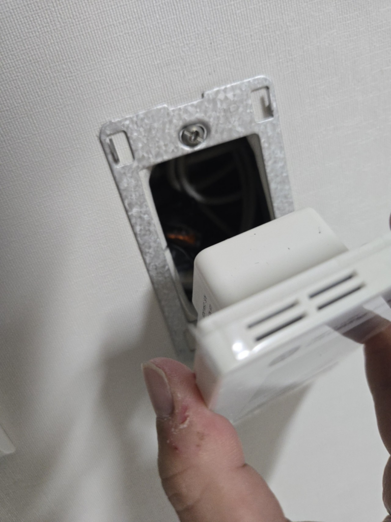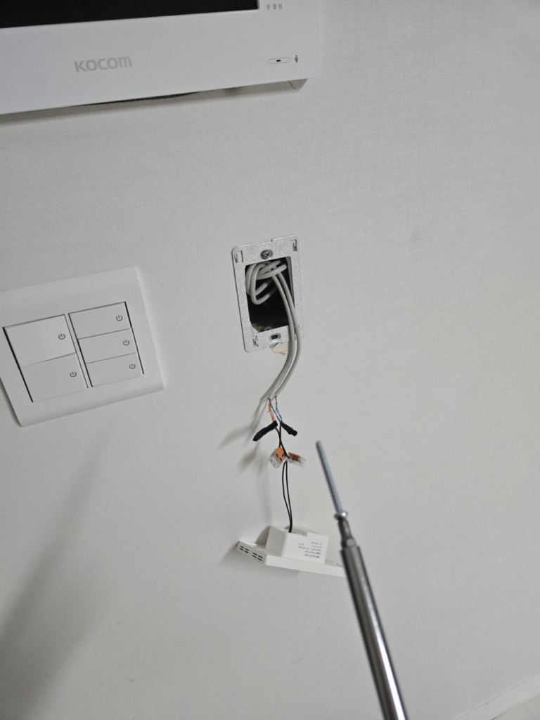 기존 제품을 열어봅니다. 기존 제품이랑 신품이랑 형태는 완전히 동일하니까 플래이트를 굳이 까지 않고 제품만 변경해보려 합니다. 그와중에 플래이트에 나사가 상단만 박혀 있어서, 새 제품에 같이 제공된 나사를 하나 활용할 생각입니다. 왜 이런 스위치 박스에 나사를 하나만 박는 경우가 많을까요..?