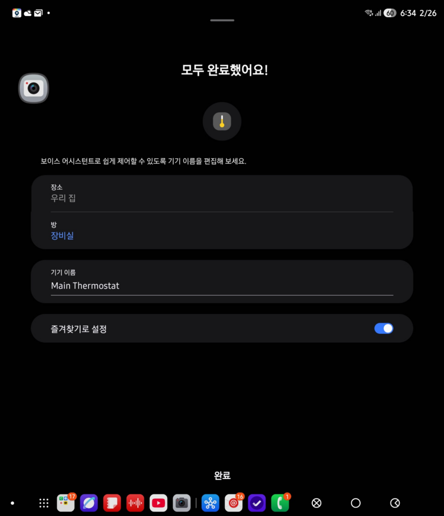 갑자기 기기 등록이 완료되면, 일단 매인 조절기가 먼저 잡힙니다. 방 선택하고, 기기이름 바꾸고 완료 합니다.