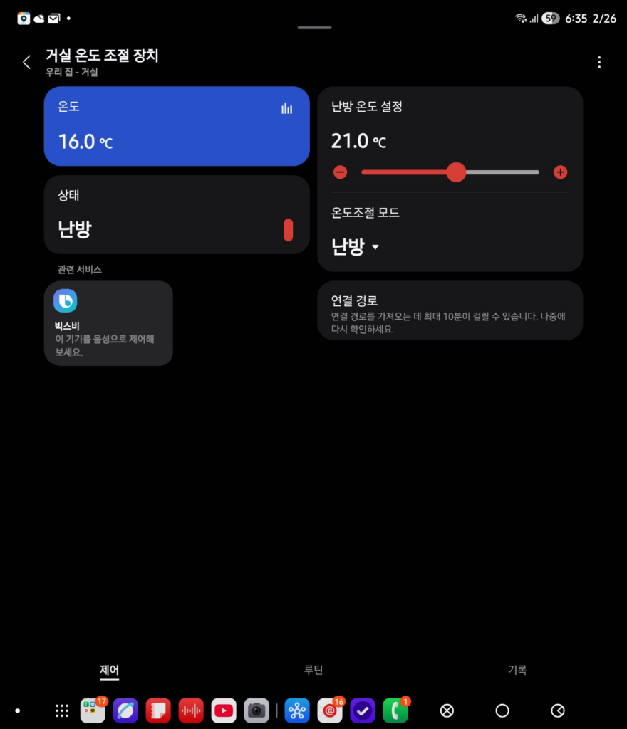 - 반대로 온도조절기에서 조절한 값의 업데이트는 상대적으로 늦습니다. 상태가 바뀌는 건 한 2초 내외로 반응하는데, 난방 온도 바꾸고 나면 상황에 따라 다르지만 5~10초 정도 걸립니다.