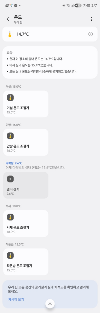 스마트싱스에는 우리집의 평균 온도를 보여주기도 합니다. 그리고 제안을 해주거나 설명을 추가해주는 식으로 안내가 되네요. 온도조절기들이 1도 단위로만 보고되버리니, 약간 아쉽긴 하지만. 굳이 그렇게 정교한 온도 표시는 필요 없다는게 또 제 생각이라서… (그리고 아마 각방에 에어컨 들어가게 되면 그 에어컨이 온도를 보고해줄 것이라 생각되기 때문에… 뭐 더 필요하지는 않을 것 같습니다 ㅎㅎ)